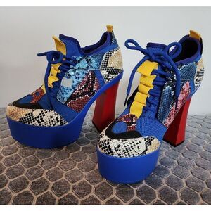 Elevate your look with these striking platform sneakers. Featuring a bold blue and yellow design with unique patterns, these shoes are perfect for making a statement.