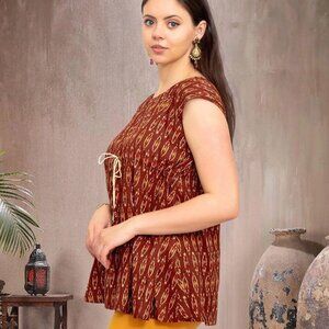 Embrace unique fashion with this brown and red printed short top that will add a stylish touch to your casual wardrobe and make everyday outfits exciting.