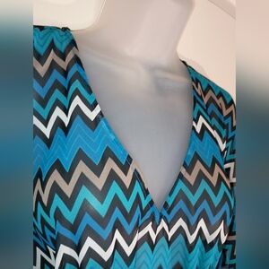 This beautiful swimsuit coverup has a eye-catching zigzag pattern. It features a dynamic combination of blue, teal, black, white, and gray colors arranged in a chevron design. The coverup has a flattering V-neckline that adds a touch of elegance to its overall look. A black waistband, adorned with a decorative circular buckle at the center, cinches the waist and provides a defined silhouette.