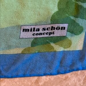 Bright scarf with circular designs. Features blue, green, and yellow hues. Measures 72” long by 26” wide. Can be wrapped around your neck! Great with white for instantly feeling like spring breeze or summer sunshine 🌞 chiffony feeling so will be cool and move in a light breeze. Created by German designer Mila Schon concept, chefs kiss💚 for its beauty! Thanks for the visit 💜🌴