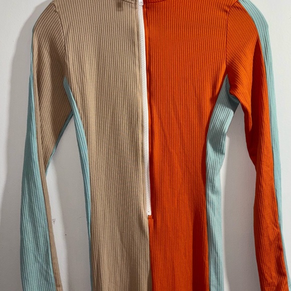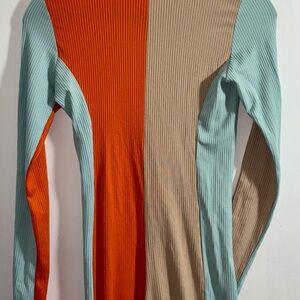 Eye-catching ribbed top with a bold colorblock design. Features striking orange, tan, and light blue panels.