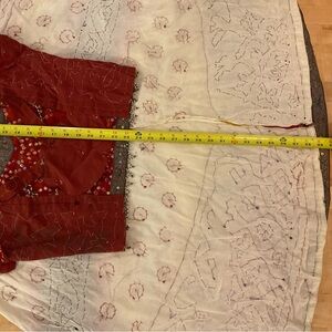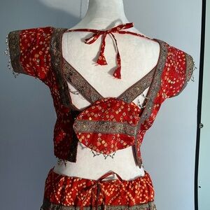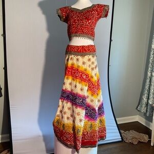 This Vibrant Dopamine Bollywood Beaded, Sequined, two piece outfit is beautifully hand crafted with great attention to every detail. It radiates Pure Joy. Although it has no size listed, from the fit on the mannequin, I am guessing it is a small by the bodice size. The skirt is adjustable as it has a drawstring waist. Measurements are shown in photos. This is a one of a kind completely hand made item, and must be seen to be fully appreciated!