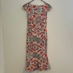 Elegant fitted dress with intricate red and white patterns. Perfect for any occasion.