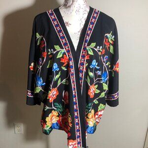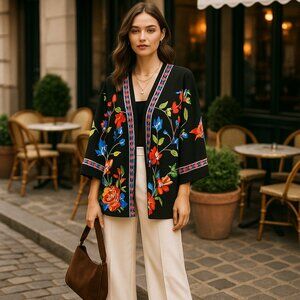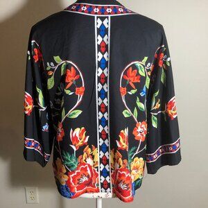 Bring the beauty of fall into your wardrobe with this bold floral kimono-style jacket. A striking mix of rich jewel tones against a black backdrop makes it the perfect transitional piece — light enough to layer, yet dramatic enough to stand on its own. Designed in a soft, comfortable stretch fabric (95% Polyester, 5% Spandex), it drapes beautifully for an effortlessly slimming boutique look.