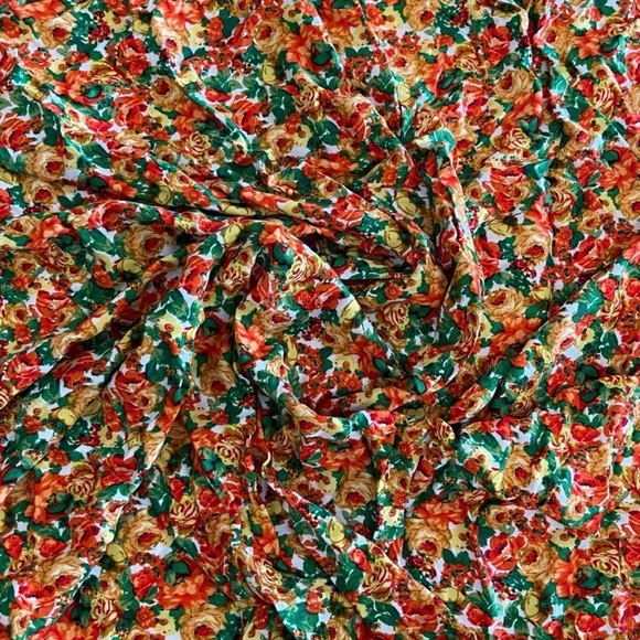 Vibrant floral patterned fabric with red, green, and yellow hues. Perfect for crafting or sewing projects.