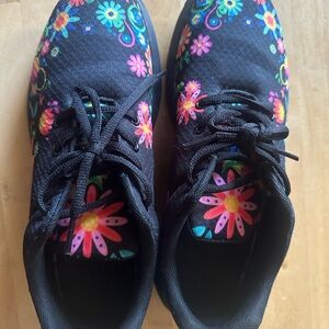 These stylish shoes feature a vibrant floral design on a black background, perfect for adding a pop of color to any outfit.