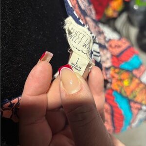 Colorful dress featuring a vibrant geometric pattern with red, blue, and orange accents.