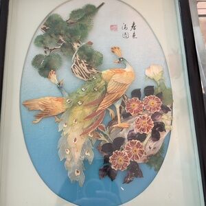 Vibrant Green and Blue Bird Art Framed in black lacquer 15” x 11”.., STUNNING 😍