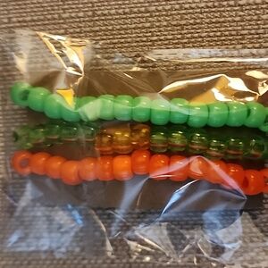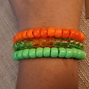 Add a pop of color to your outfit with this vibrant bracelet set. Featuring bright green and orange beads, these accessories are perfect for any occasion.