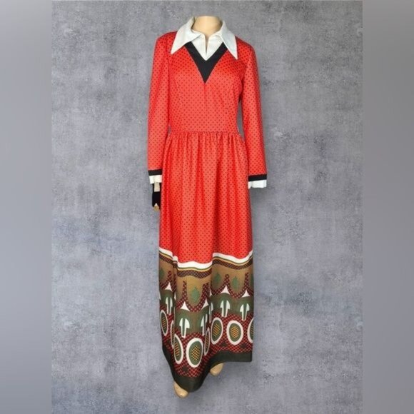 Step back in time with this vibrant handmade 60's maxi dress. Featuring a unique Pucci-esque geometric floral and mushroom print, this dress is a perfect blend of retro charm and bold style. Ideal for vintage fashion lovers, it's an eye-catching addition to any wardrobe.