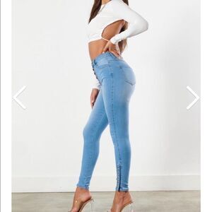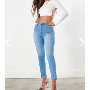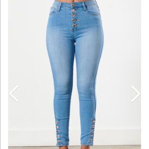 A new twist on a classic button up skinny. These jeans feature rose gold tone hardware and 5 snap-button ankle detail.