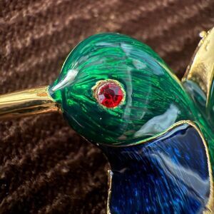 Elevate your style with this stunning hummingbird brooch, beautifully enameled in rich shades of green and blue with a gleaming gold-tone finish. The wings and tail feathers are detailed with golden edges, while a brilliant red gem eye adds a striking touch of personality. Its bold, graceful shape and vivid colors make it a standout accessory for any nature lover.