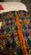 Colorful dress with a bold leaf pattern. Features orange, purple, green, and black hues.
