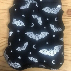 A festive Halloween dog hoodie, perfect for your small furry friend. This black hoodie features a playful pattern of bats, stars, and crescent moons in a reflective silver color. Designed for toy breeds like Yorkies and Fox Terriers, this hoodie will keep your pup cozy and stylish during spooky season. Ideal for Halloween parties, trick-or-treating, or festive photoshoots.