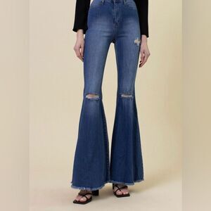 These Vibrant MIU Dark Blue High-Rise Flare Jeans combine vintage Western attitude with Y2K boho flair. Crafted in the USA from a soft cotton-blend stretch denim, they feature ripped knees, frayed raw hems, and dramatic bell-bottom flare for a statement silhouette. Classic five-pocket style with zip-fly and button closure. Slight distressing and one faint spot at lower left leg (see photos).