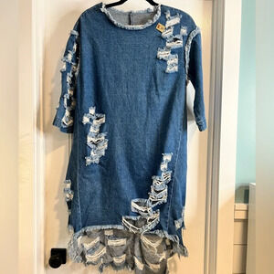 Vibrant MIU Distressed Denim 3/4 Sleeve High Low Dress. Size Small. NWT.
