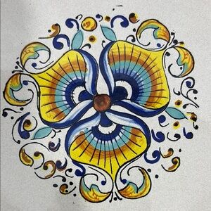 Add a splash of color to your home decor with this vibrant floral ceramic plate. The intricate design features a blend of blue, yellow, and orange hues, perfect for any occasion.