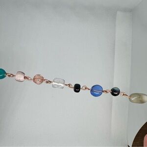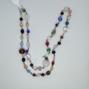 This playful necklace features a vibrant array of small, round beads in blue, red, green, yellow, and clear hues, arranged in a random pattern. Its multi-strand design adds a touch of fun and casual elegance, perfect for everyday wear. The necklace is completed with a subtle silver-colored clasp for easy fastening.