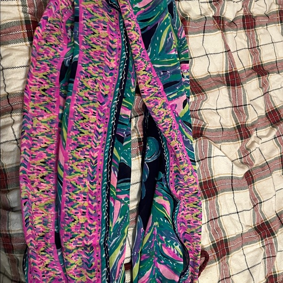 Flowy scarf with bold, colorful stripes and abstract print. Rich purple, teal, pink, and navy tones. Lightweight drape and eye-catching pattern. Versatile for day or evening wear. Scarf is circle and wrap around the head.