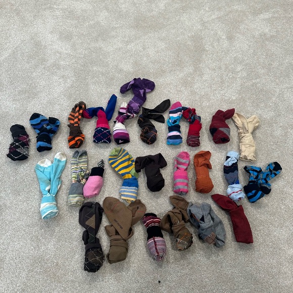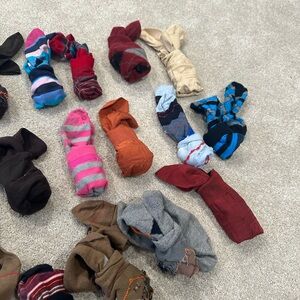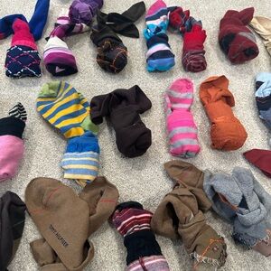 A lively assortment of socks in various colors and patterns. Perfect for adding flair to your outfit. Some brand new and brand name.