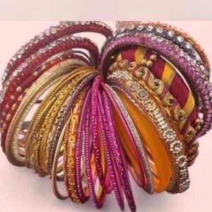 Enhance your style with this vibrant multicolor bangle set. Featuring shades of red, pink, orange, and gold, these bangles are perfect for any occasion. A stunning addition to your accessory collection.