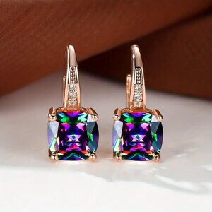 Vibrant Mystic Rose Gold Square Rainbow Color Zircon Earrings