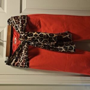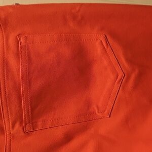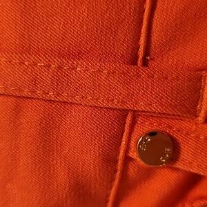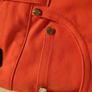 Make a bold statement with these vibrant orange cropped jeans. Perfect for casual outings, these jeans offer both style and comfort. Dress it up with a belt and match shoes to the scarf. Shoes and scarves not included. Just offering a way to style it up!