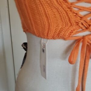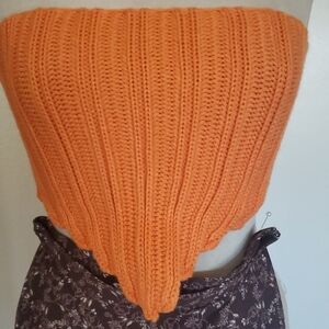 This eye-catching orange crop top features a ribbed knit texture, offering a cozy and stylish look. The vibrant color and classic crew neckline make it a standout piece for any casual occasion. Its cropped design adds a modern twist to a timeless style.