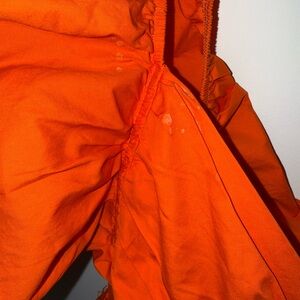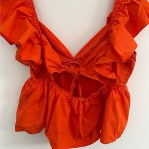 Elevate your style with this vibrant bright orange ruffle blouse. Perfect for adding a pop of color to any outfit. Some signs of wear but hidden under ruffles