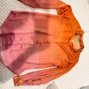 Eye-catching shirt with a vibrant graphic design. Features bold orange and pink colors with a unique print.