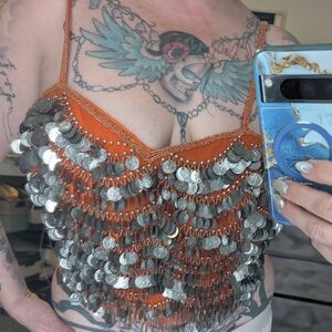 This eye-catching crop top features a bold orange hue complemented by striking silver coins, creating a unique and exotic look. Purchased from my belly dance teacher who brought it from Egypt. Triple layer hook and eye closure in back. I wear 38/40 D/DD and the top is currently on the loose side. Always get tons of compliments in this. The lovely jingles will be sure to capture everyone's attention.