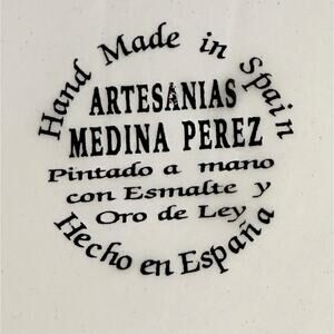 This is a beautiful, vibrant and colorful ceramic plate from Medina Perez, Spain. It features hand-painted enamel and stunning gold accents with a thick gold accented rim. The plate measures 6 inches in diameter and is in excellent condition. It would make a wonderful addition to any collection or a unique decorative piece for your home. It is designed to be a wall hanging also. Don't miss the opportunity to own this beautiful piece of Spanish craftsmanship! # 4736