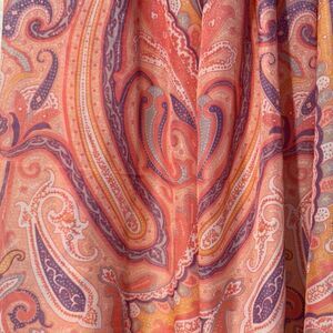 Stylish scarf with a lively paisley design. Features bold pink and orange hues. Ideal for a chic look.