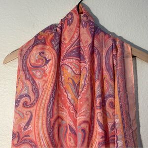 Stylish scarf with a lively paisley design. Features bold pink and orange hues. Ideal for a chic look.