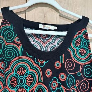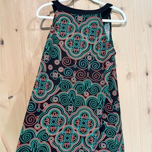 This vibrant dress features a striking pattern in black, red, and green. Perfect for making a statement, it combines style and comfort effortlessly.