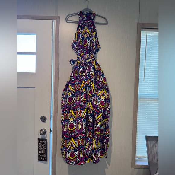 Make a statement with this vibrant maxi dress featuring a bold geometric pattern. Perfect for any occasion, this dress combines style and comfort effortlessly.