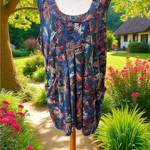 Add a splash of color to your wardrobe with this vibrant sleeveless tunic. Featuring a stunning mix of blue and red patterns, it's perfect for any casual outing.