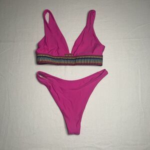 Vibrant Pink Bikini Set with Patterned Waistband Size Large