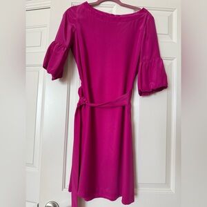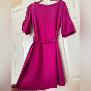 Elegant and timeless, this Jessica Howard dress features a vibrant fuchsia hue and a smooth satin-like polyester fabric that drapes beautifully. It has a classic sheath silhouette with a removable waist tie to accentuate your figure. The dress includes elbow-length puff sleeves with gathered details for a feminine touch and a back zipper closure. Fully lined for a comfortable, polished fit.
