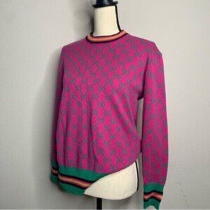This vibrant pink designer sweater features an all-over interlocking pattern that adds a touch of luxury and sophistication. Accented with green ribbed hem and cuffs, the sweater also includes bold multicolor stripe details that give it a playful yet elegant vibe. The soft, high-quality fabric ensures comfort while maintaining a stylish, structured fit. Perfect for casual chic looks or dressing up with a pair of tailored pants, this sweater is versatile enough to elevate your wardrobe for any occasion. Ideal for those who love bold patterns and bright colors that make a statement!