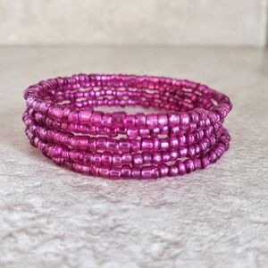 This striking bracelet features multiple delicate strands in a vibrant pink hue, creating a layered and elegant look. The small beads catch the light beautifully, adding a touch of sparkle to any outfit. A versatile accessory for any occasion.