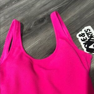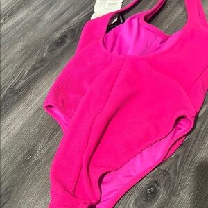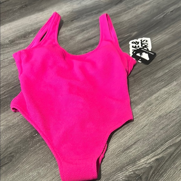 Bright pink one-piece swimsuit. Perfect for a bold beach look.