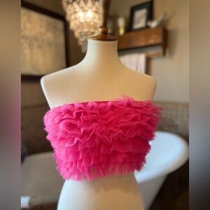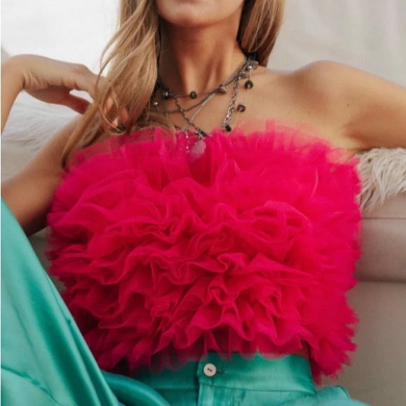 Make a bold statement with this vibrant pink ruffled crop top. Perfect for a night out or a special occasion.