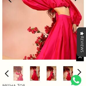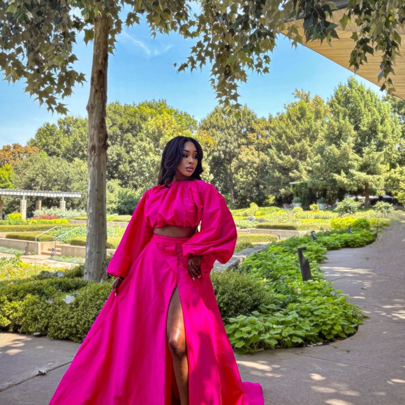 Stunning two-piece gown in vibrant pink. Features a long skirt with a high slit and a matching top with voluminous sleeves. Perfect for a birthday shoot or event.