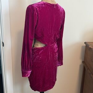 Item 193 - Make a bold statement in this eye-catching fuchsia velvet mini dress! Featuring a flattering twist-knot front and chic side cut-out detail, this dress brings the glam with a soft crushed velvet finish and long sleeves for a dramatic silhouette.