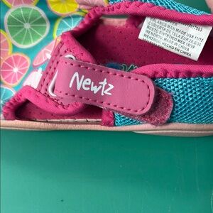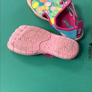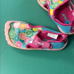 These lively water shoes boast a colorful floral and butterfly design on a pink and blue base, ideal for summer fun. With a cushioned footbed and durable sole, they provide comfort and practicality for water activities. The slip-on style ensures easy wear for adventurous days.