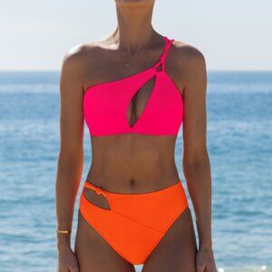Stand out at the beach with this vibrant pink and orange bikini set. Perfect for making a bold statement.