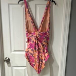 Vibrant Pink and Orange One Piece with Plunging V-Neck and matching coverup.
