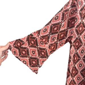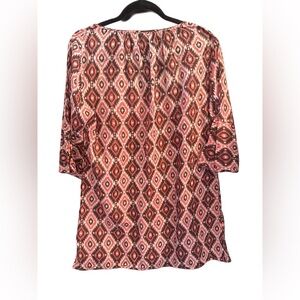 This eye-catching blouse showcases a lively pink and orange color palette with a boxy silhouette. The three-quarter sleeves provide a stylish touch, while the longer length enhances its tunic appeal, making it a versatile addition to any wardrobe.