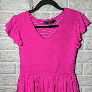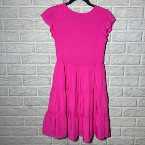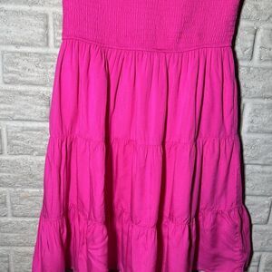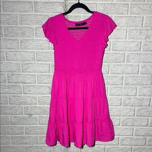 Bright pink dress with a tiered design. Features a V-neck and short sleeves. Stretchy chest area No flaws seen Lined X350